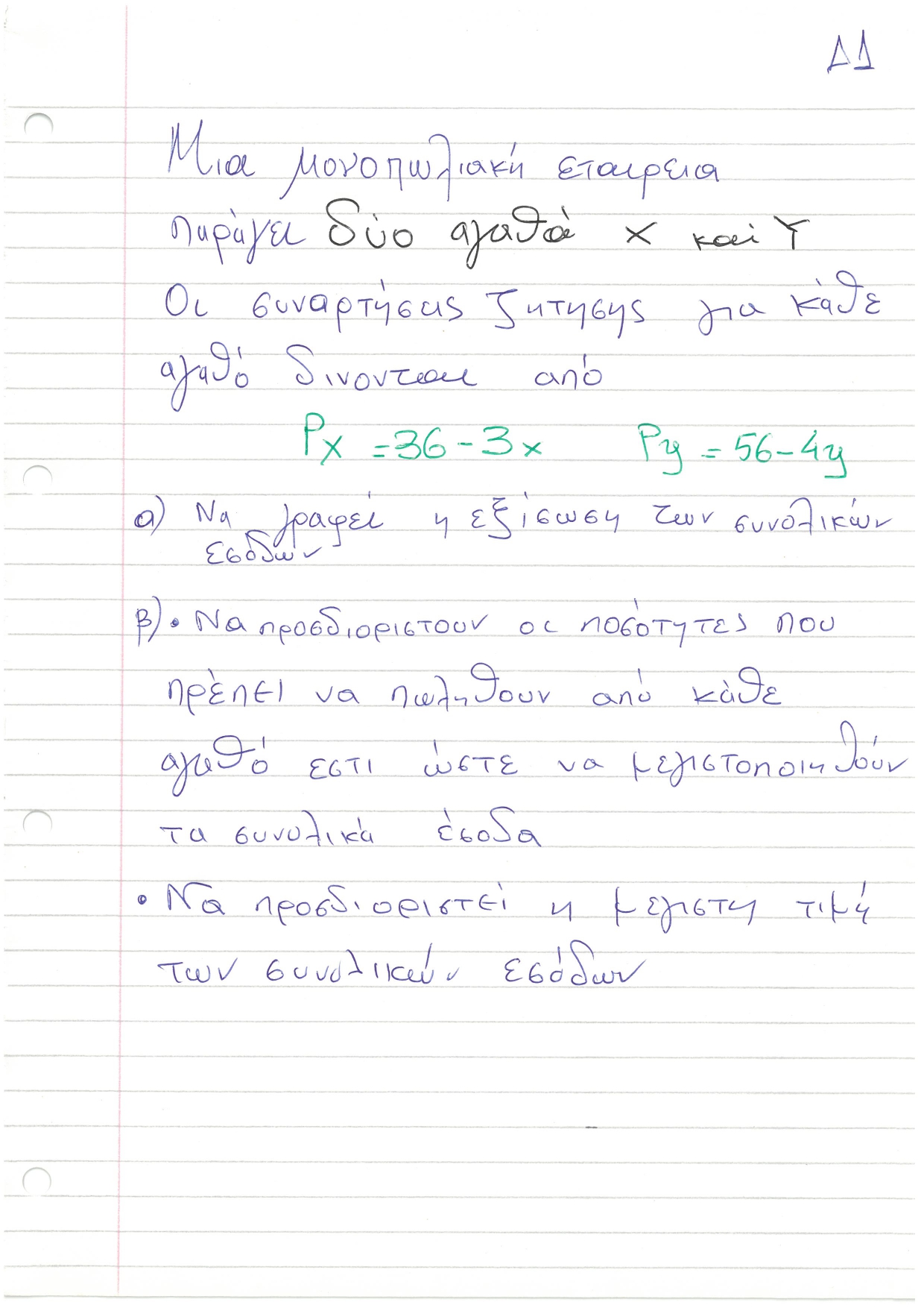 Μια μονοπωλιακή εταιρεία παράγει 2 αγαθά X και Y η συνάρτηση ζήτησης για κάθε αγαθό δίνεται από
